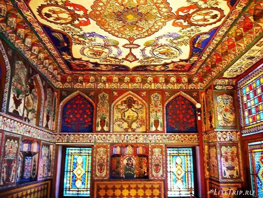 Sarayın “naxış seli”nə bələnmiş interyerinin qibtəedici bədii tutum almasında onun plafonlarının daşıdıqları estetik tutumun rolu da duyulandır. Tikilinin iki əsas zalının hər birindəki iki, ikinci mərəbənin yan otaqlarının hər birindəki bir plafon bu mənada diqqətçəkəndir. İkinci mərtəbədəki zalın şimal plafonunun əsas sahəsini böyük və işıqlı medalyon tutur. Öz növbəsində onun da ortasında bir qədər kiçik-naxışlı medalyon yer almışdır. Onunla Mehmandarovun evinin kiçik otağı və ev məscidinin plafonları arasında oxşarlığın mövcudluğu bizə hər iki tərtibatın Usta Qənbər tərəfindən yerinə yetirildiyini ehtimal etməyə əsas verir. İkinci mərtəbənin yan otaqlarındakı plafonlarla Şəkixanovların evindəki zalın plafonlarının oxşar ortaq-oval plafona malik olmalarını da səbəbsiz saymaq olmaz. Ümumi bədii tutumuna görə onlar əsas zalların plafonlarından bir qədər geri qalsalar da, bütünlükdə onların ağ yerliyində mavi budaqlarla əlaqəli verilmiş quş və heyvan təsvirləri kifayət qədər cəlbedici görünür.