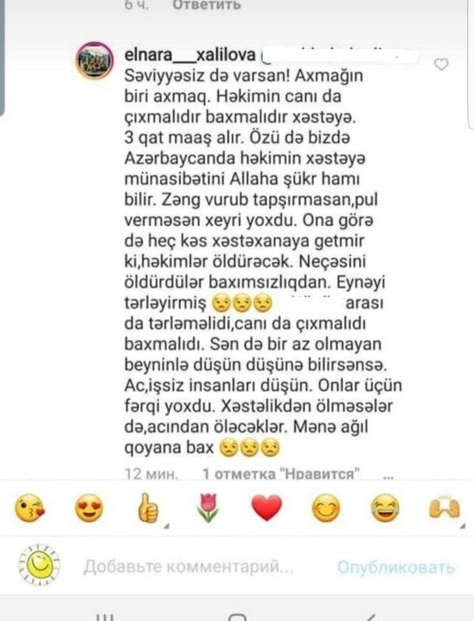 “Səhər açılandan bütün həkim dostlarım və həkim qohumlarım mənə yazır ki, həkimləri niyə təhqir etmisən?! Əvvəlcə heç nə anlamadım və məsələnin instagram səhifəmlə bağlı olduğunu öyrəndim. Təbii ki, səhifəmi işlədən şirkətlə əlaqə saxladım və bu neqativ halın necə baş verməsi ilə maraqlandım. Və məlum oldu ki, gecə ilə mənim instagram səhifəm hack olunub”.