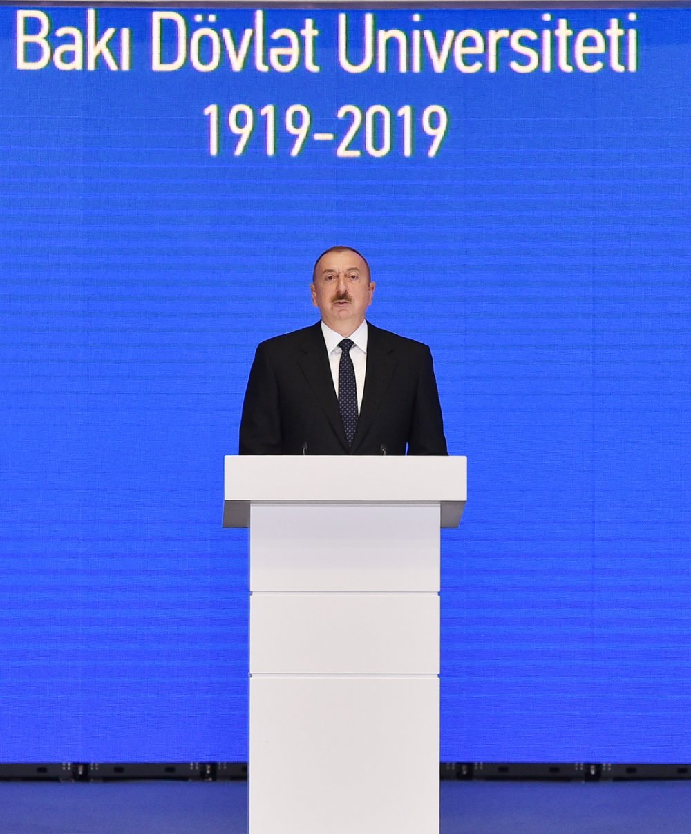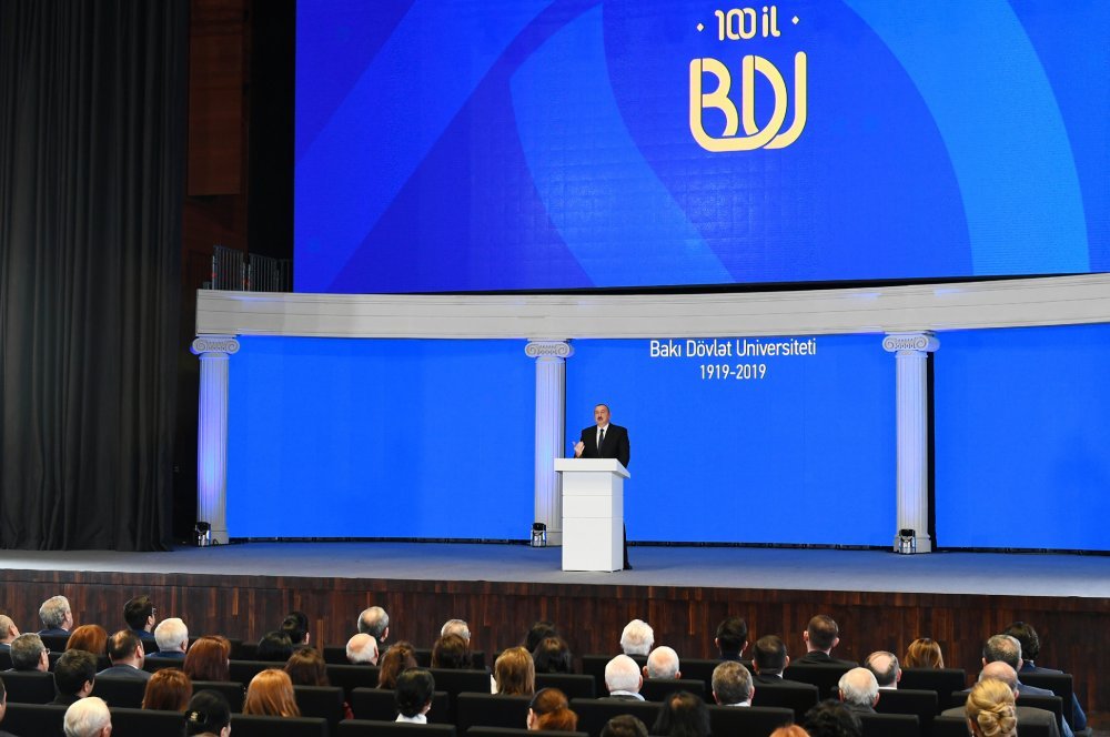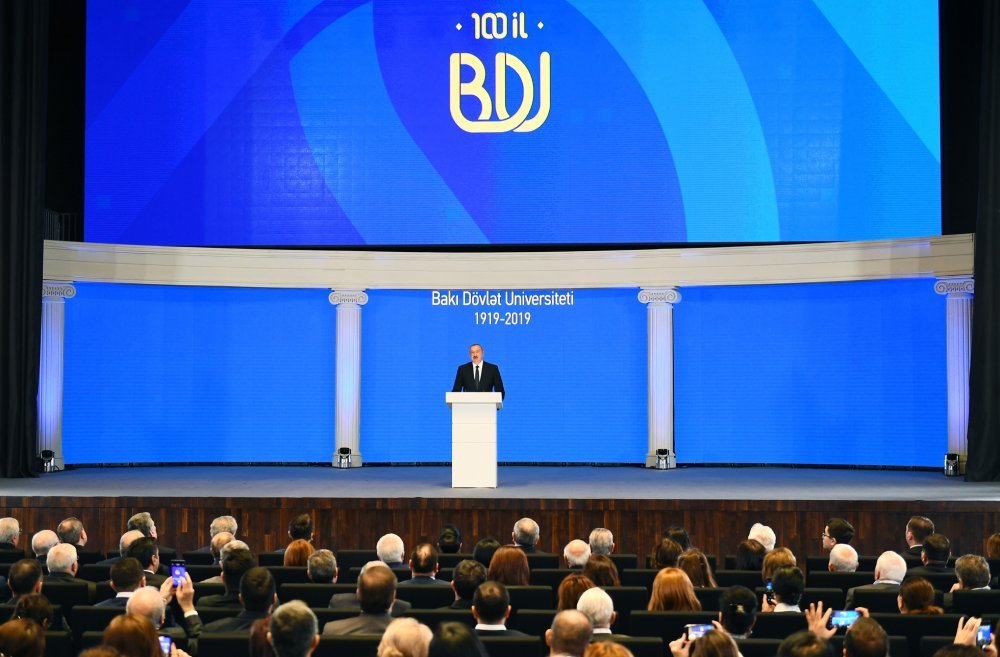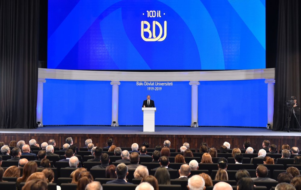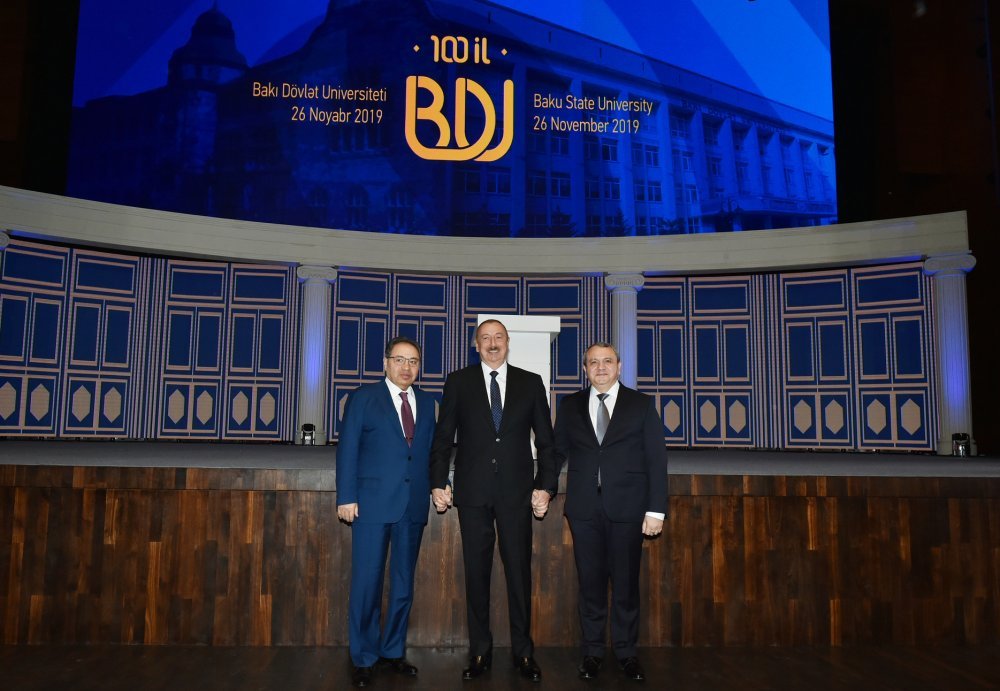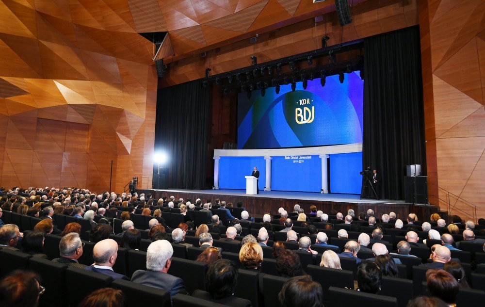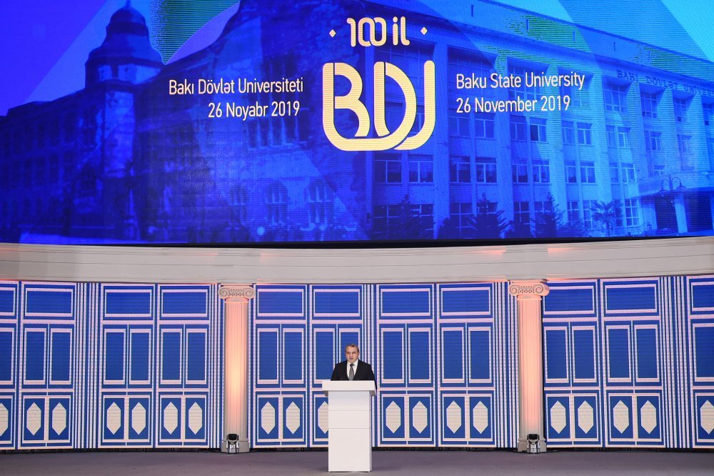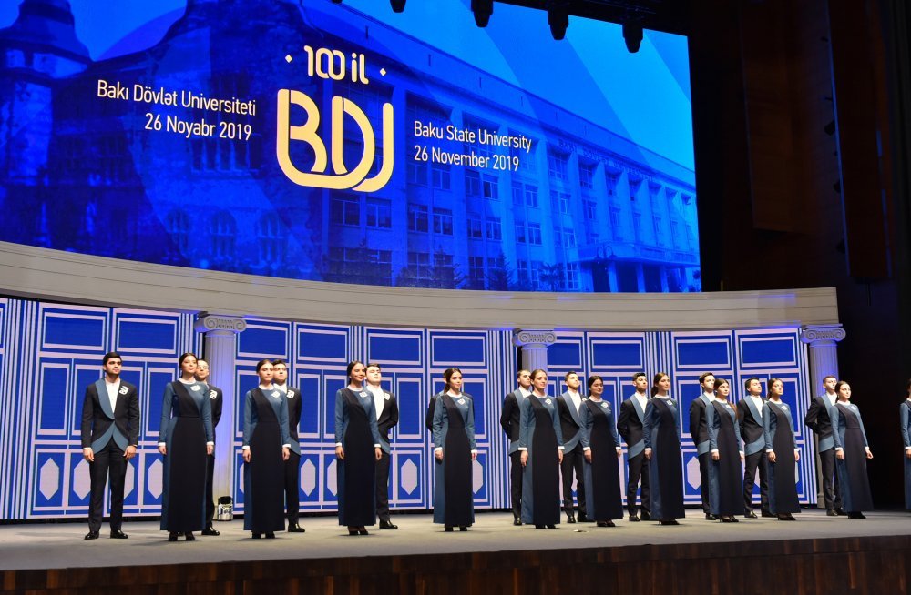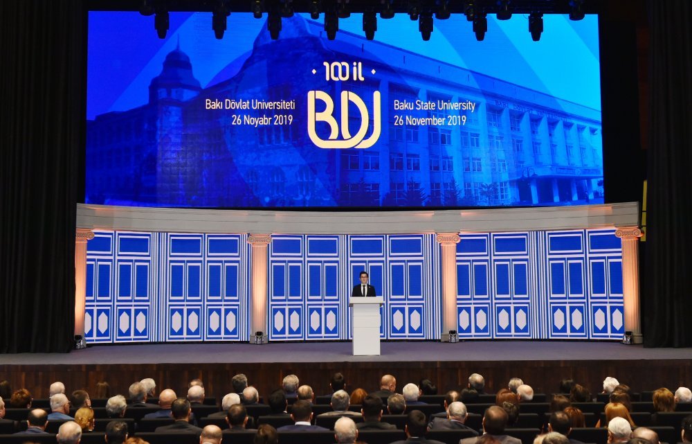 26 ноября в Конгресс-центре прошла церемония по случаю 100-летнего юбилея Бакинского государственного университета. В церемонии принял участие Президент Азербайджанской Республики Ильхам Алиев. Глава государства выступил на церемонии с речью. Затем выступили ректор Бакинского государственного университета Эльчин Бабаев и профессор университета, доктор юридических наук Фируза Аббасова. Позже в исполнении пианиста Этибара Асадлы была представлена композиция «Посвящение» о 60 известных ученых Бакинского государственного университета. На церемонии выступил студент второго курса факультета журналистики Бакинского государственного университета Рашад Иманов. Состоялась презентация цифровой графики, охватывающей научную сферу по 16 факультетам университета. В конце прозвучал гимн Бакинского государственного университета.
